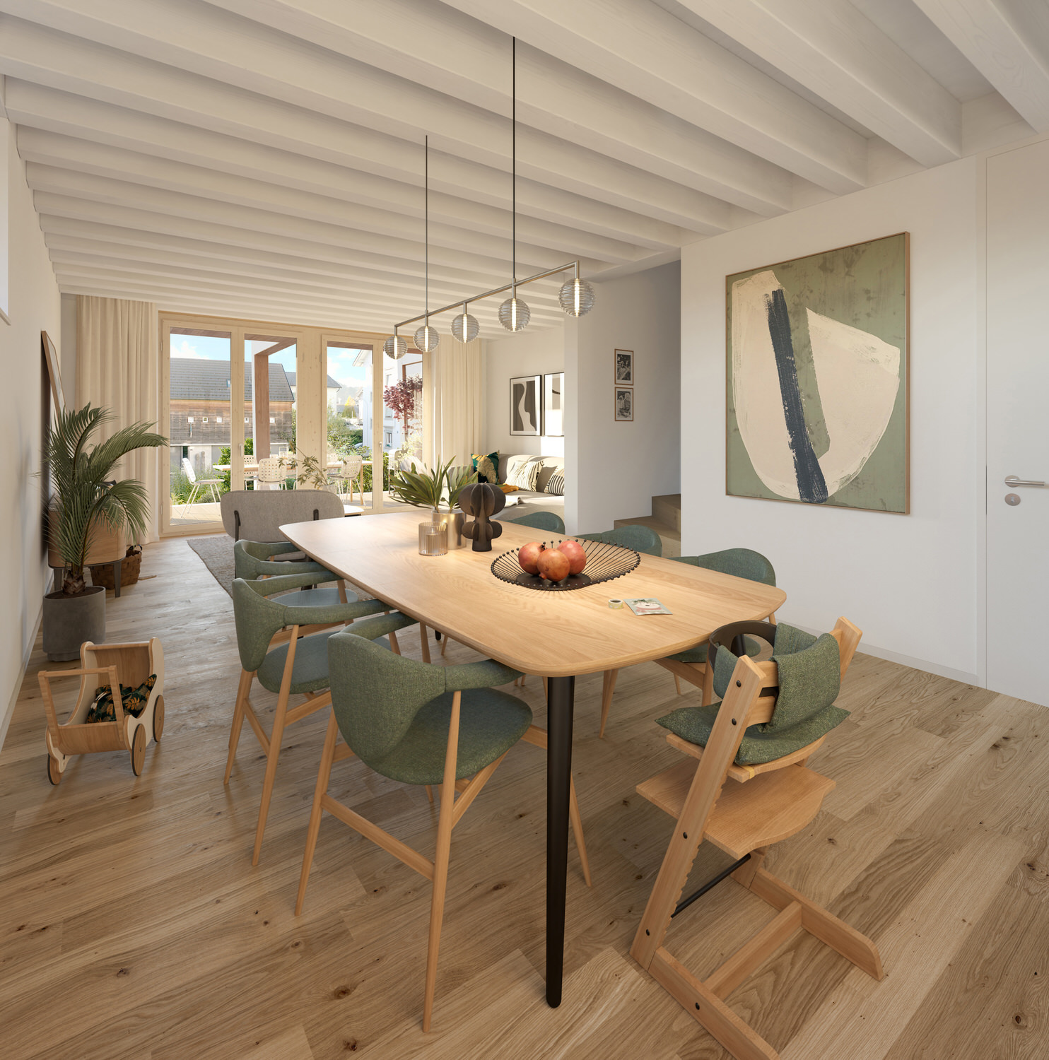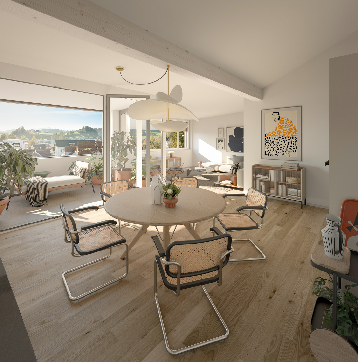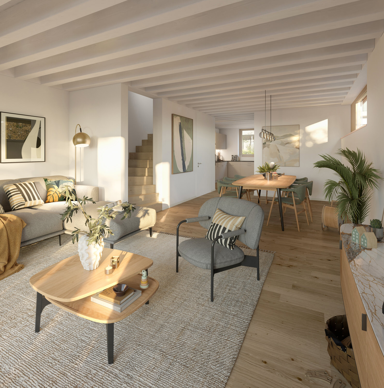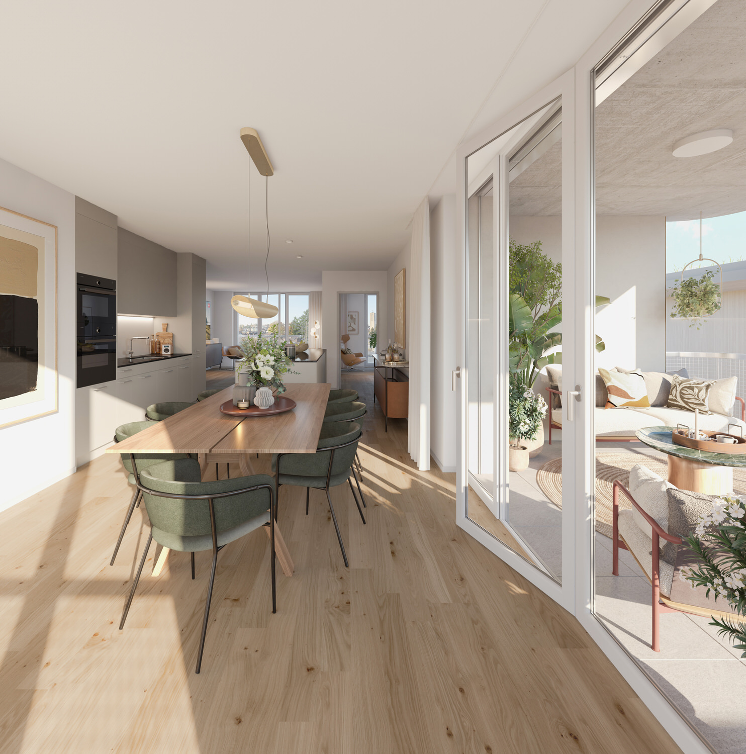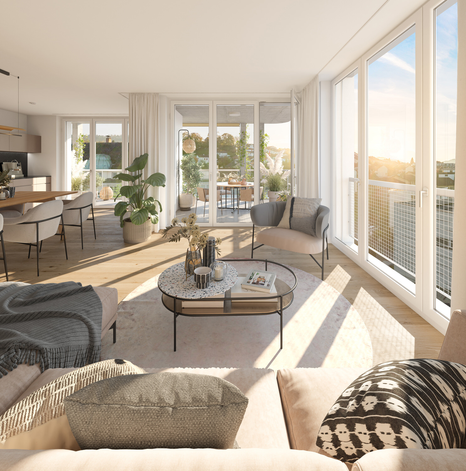 Die modernen Grundrisse bieten eine hohe Wohn- und Lebensqualität. Sie zeichnen sich durch eine offene, helle Gestaltung aus, die Flexibilität und Raum für individuelle Lebensstile bietet. Offene Wohnküchen, fliessende Übergänge zwischen Wohn- und Essbereichen sowie grosse Fensterfronten schaffen ein grosszügiges, lichtdurchflutetes Ambiente.